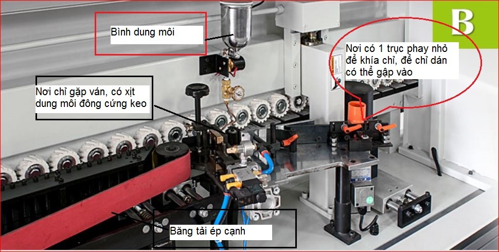 No. B : Bao gồm trục lăn keo cho cạnh thẳng, điểm xịt dung môi chỗ tiếp xúc của chỉ và ván. Băng tải ép cạnh thẳng, bình xịt dung môi lên băng tải.