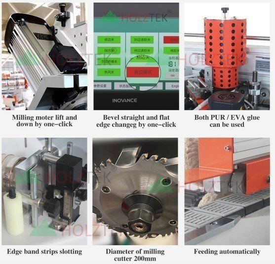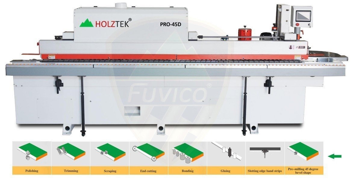 Máy dán cạnh nghiêng 45 độ Holztek, mã sản phẩm PRO-45D, máy dán cạnh với chức năng phay vát cạnh và dán hoàn chỉnh cạnh vát 45 độ, dòng sản phẩm phù hợp với dán cánh cửa tủ bếp, tủ áo rất đẹp và thuận tiện