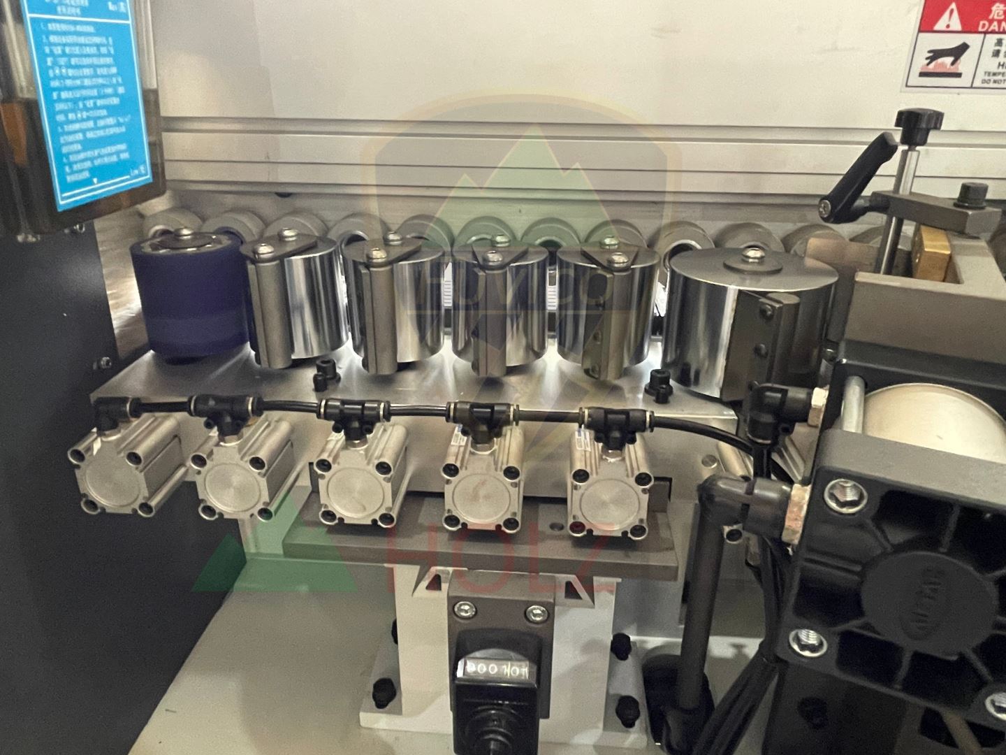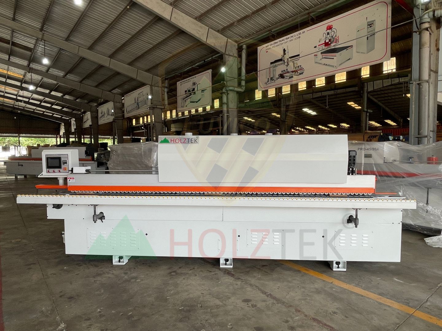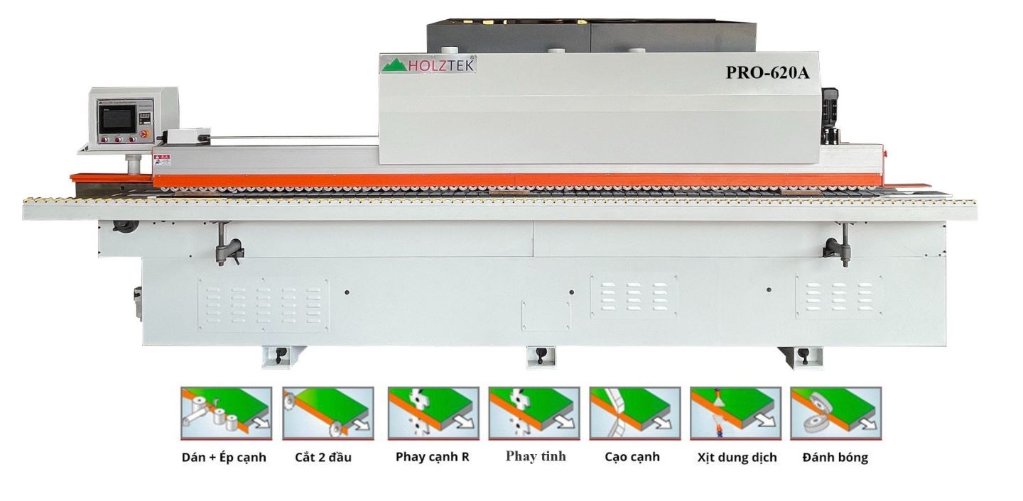 1/ Tự động đưa phôi, lăn keo, dán cạnh, cắt chỉ thừa